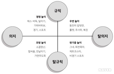로제 카이와는 요한 호이징아의 ‘호모 루덴스’를 비판적으로 계승하면서 놀이를 분류하고자 시도했다. 그는 『놀이와 인간』2)에서 놀이를 규칙과 운(運)으로 구분하면서 경쟁 놀이(agon), 우연 놀이(alea), 모방 놀이(mimicry), 현기증 놀이(ilinx) 네 가지로 구분하였다.3) 아래 그림은 ‘놀이를 하려는 의지’와 ‘규칙’을 축으로 하여 네 가지로 놀이를 구분한 것이다.